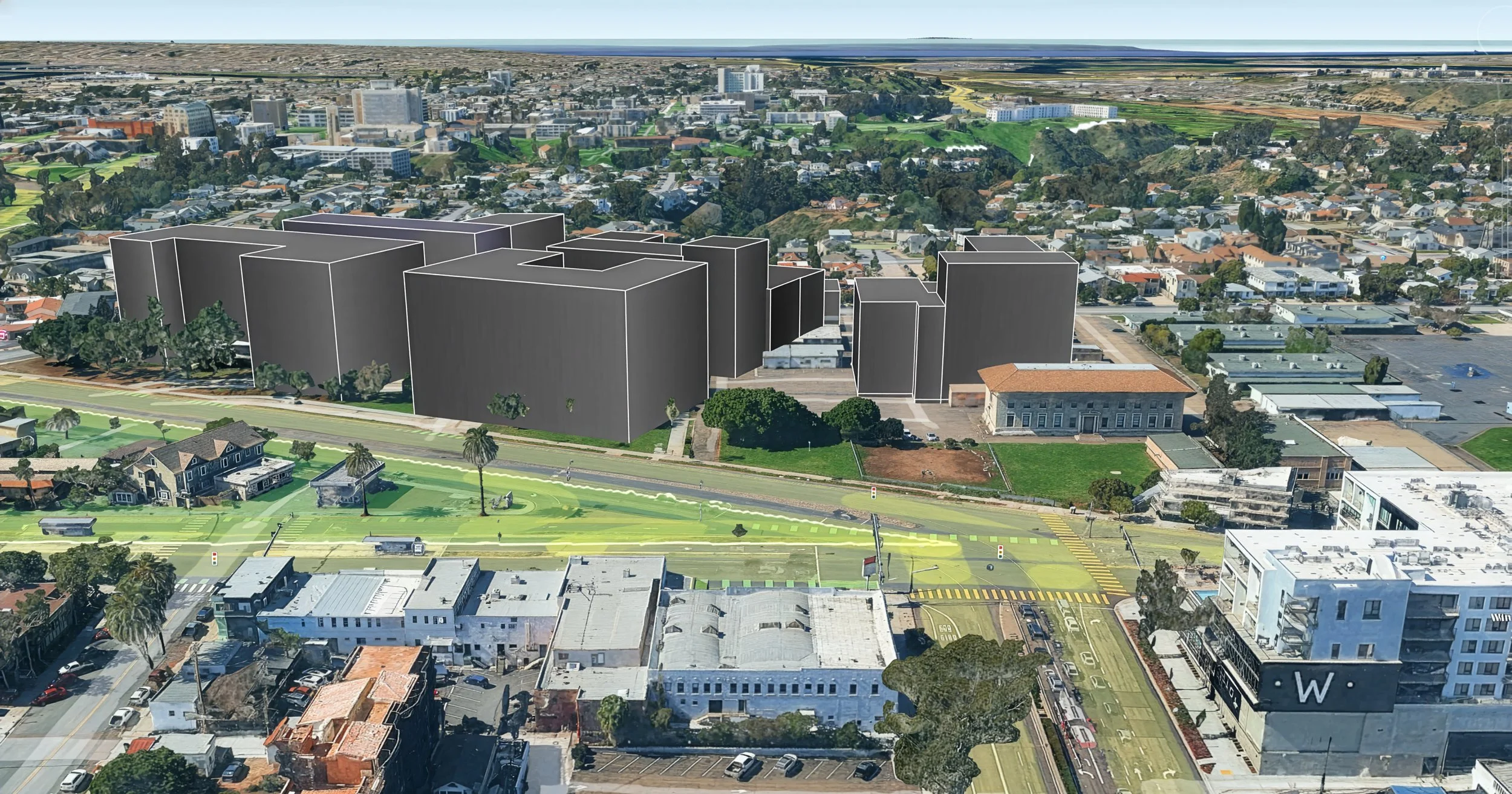 Artist Rendition using Google Earth of 11-Story Protea-Malick Proposal for Brucker Site. View from Normal St.