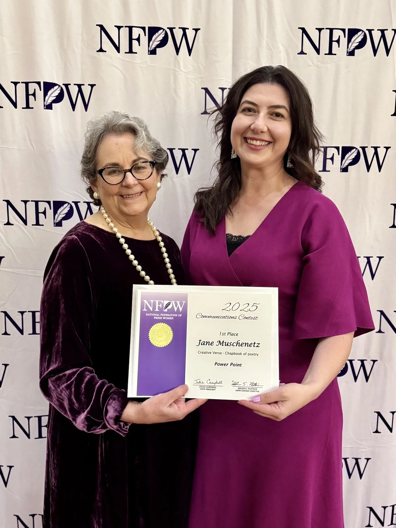 San Diego poet Jane Muschenetz, a mother of two and refugee from Soviet Ukraine, has been awarded first place in the 2025 National Federation of Press Women (NFPW) Professional Communications Contest for her poetry collection, POWER POINT. She received the award on Saturday, September 13, 2025, during the NFPW Conference in Golden, Colorado.