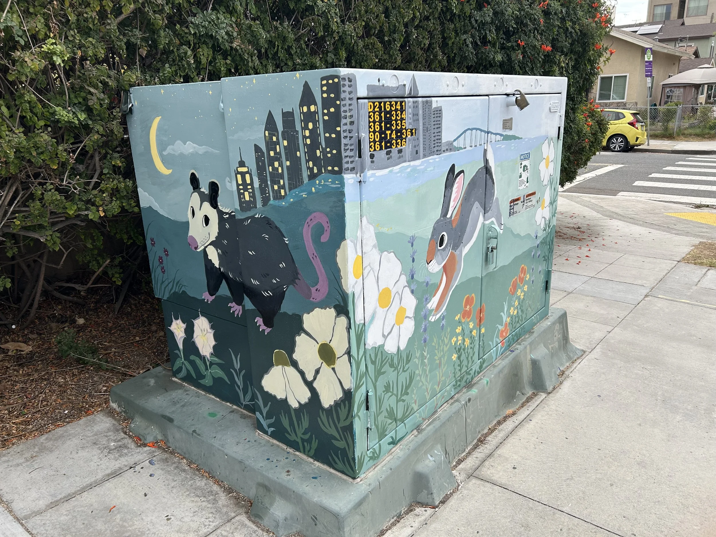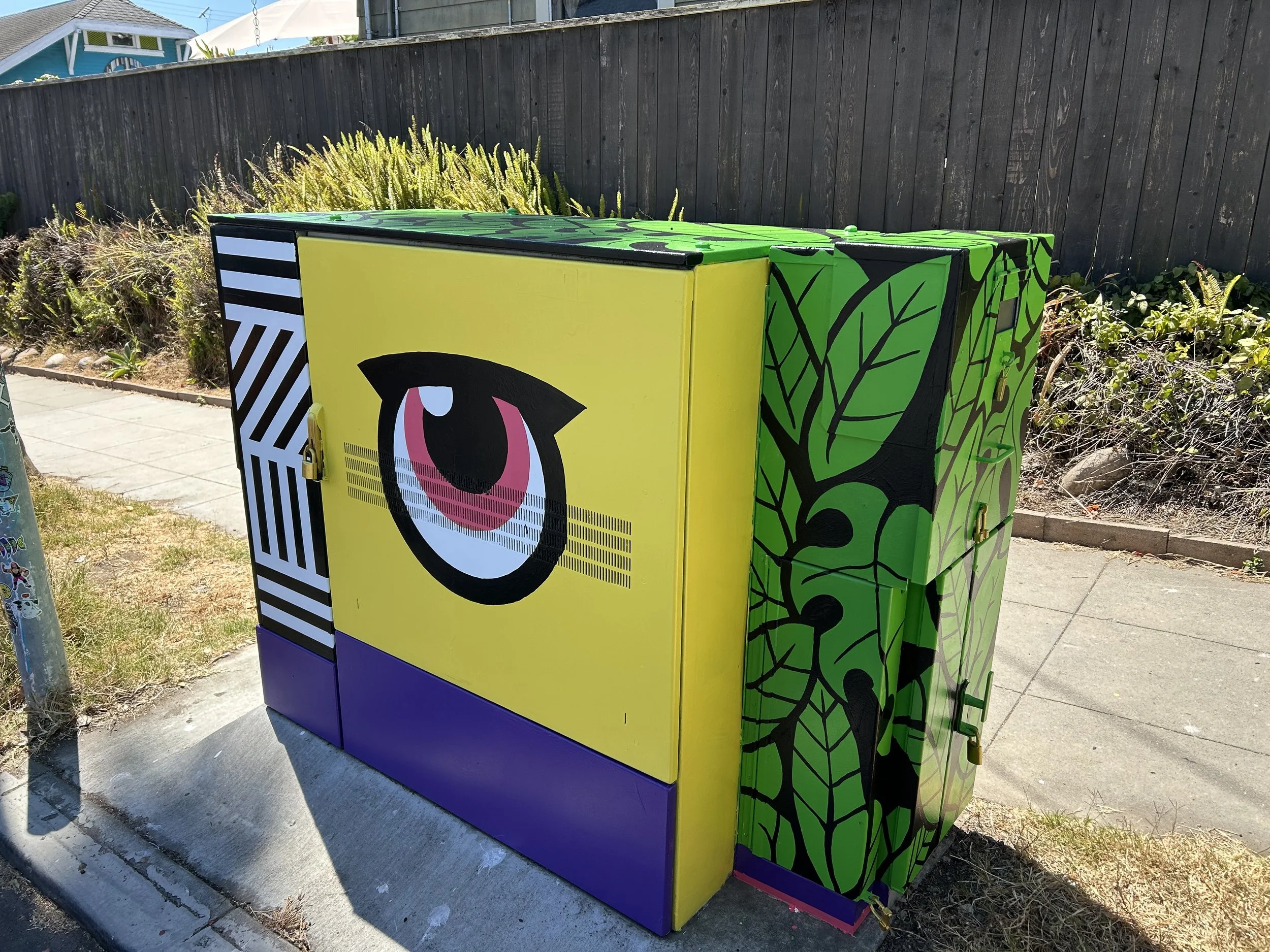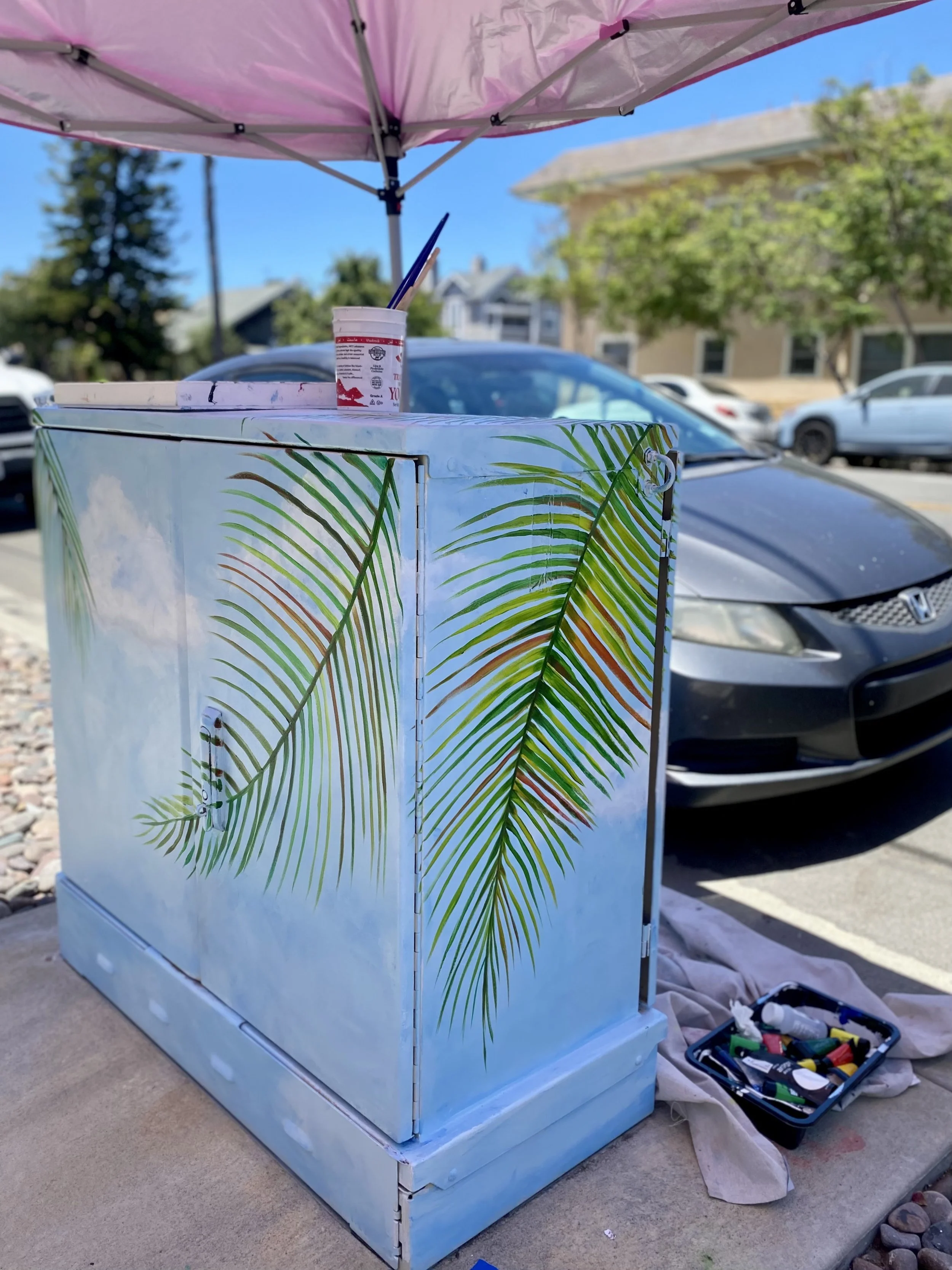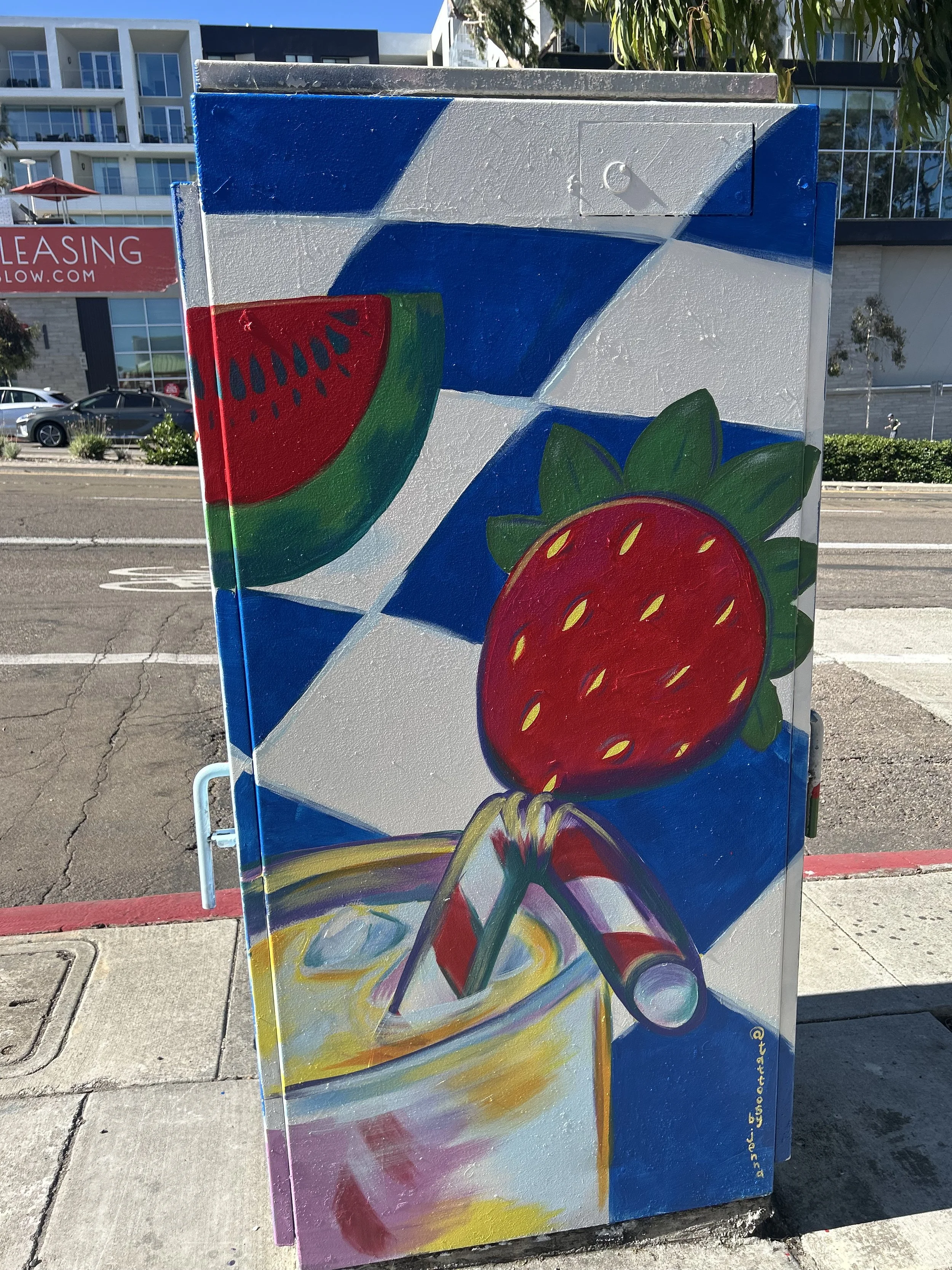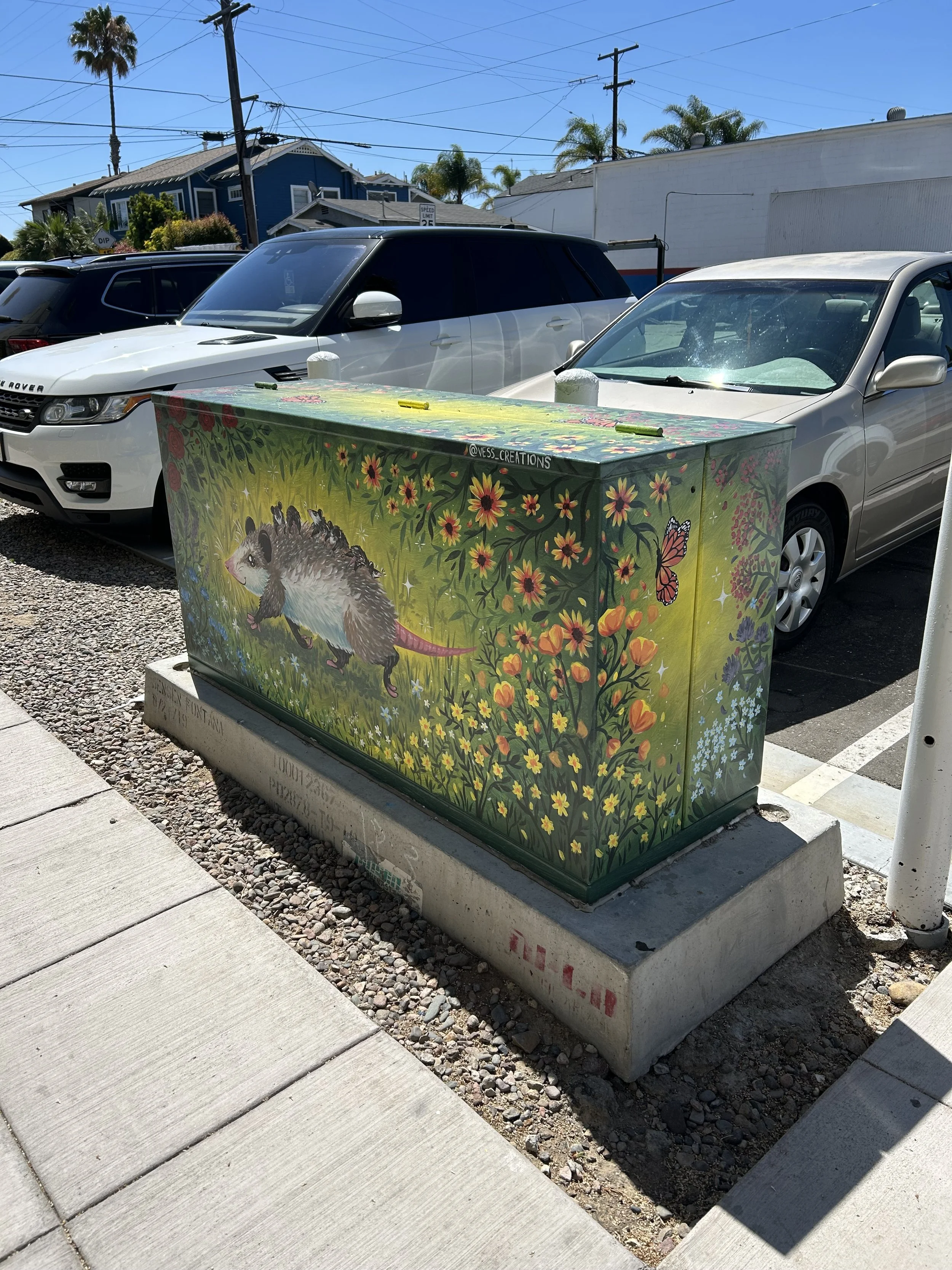 Another is a gorgeous set of boxes (25) that welcome you to UH, at the corner of Park Blvd. and Meade Ave., in front of the Birney Joint Use Field. The incredibly talented @shirishtheartist created these beauties. Her art is also featured at numerous other public spaces, such as Chicano Park, Secret Stairs, and Chula Vista’s 3rd Avenue. “Creating art allows me to visualize the collective vulnerability of my emotions through blends of color. I incorporate natural elements and surreal qualities in my work, inspired by art as a form of therapy and motivated by the idea that colors and imagery can influence people’s mindsets. I have discovered that art is a powerful tool for lifting spirits during low moments, so I create whimsical creatures with happy faces to foster positivity,” she says.