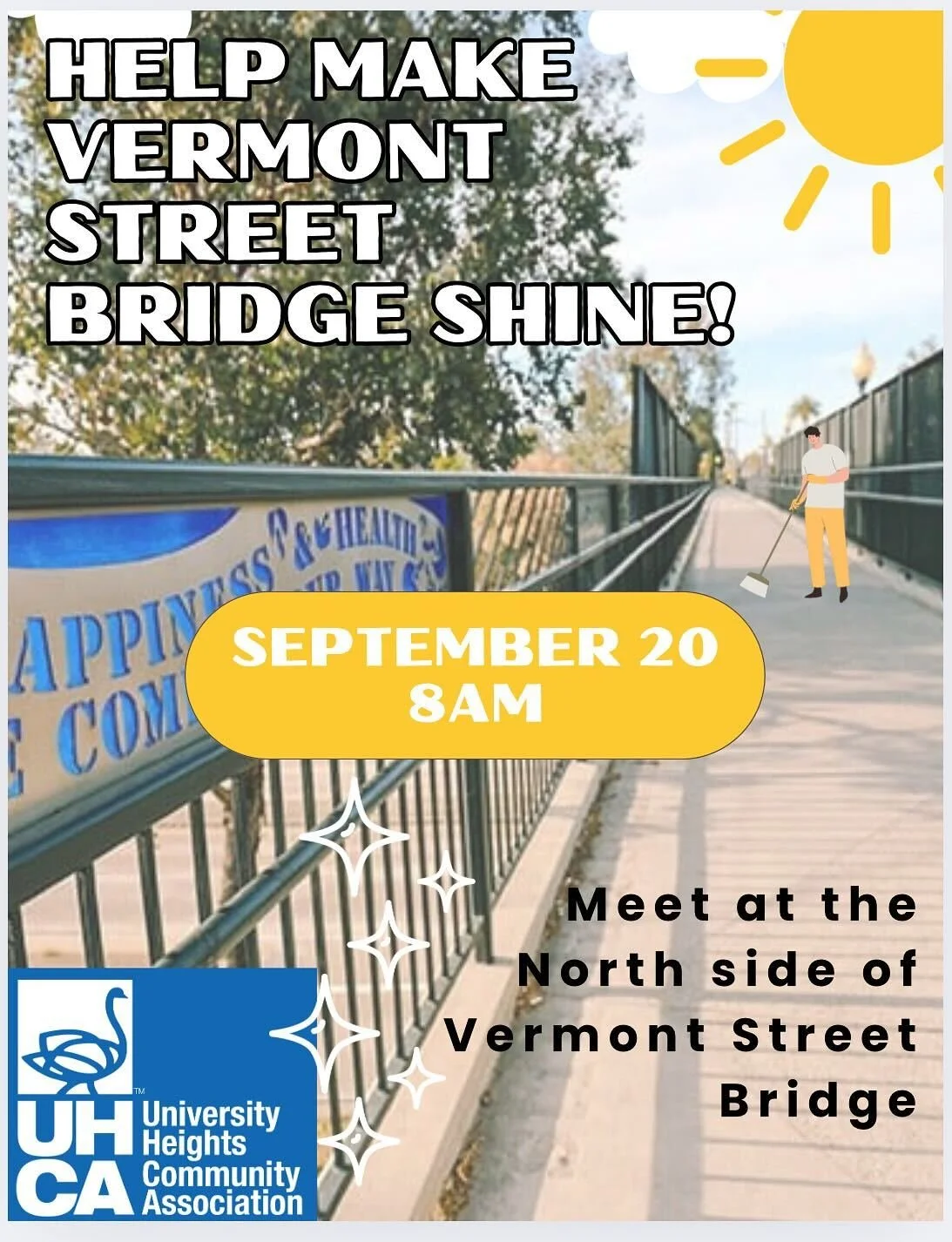 Join the University Heights Community Association’s Beautification Team on Saturday, September 20th at 8:00 AM on the north side of Vermont Street Bridge to give the bridge a quick shine. We will be sweeping, power washing, and cleaning up trash.